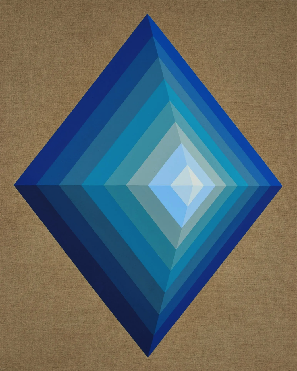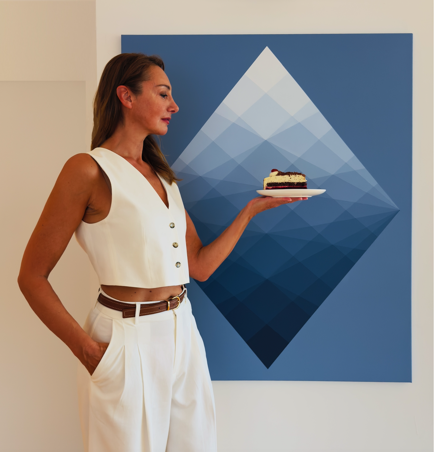 Anna described herself at this time like a robot, as she worked, and got up every day and painted. “Then came Corona, everything was closed, no exhibitions, no galleries”. Anna tells me about talking to people, art historians or art scientists. “They came to me and we talked about it like I’m telling you now,” she exclaims. An art historian had told her, “I have this very simple form, but there are all my experiences in it”. She summarises what they explained and how it accumulated, like in a real diamond. “It’s very clear, but there is a lot of information and a lot of content in it,” she tells me. “That’s what there is a complete essence and a reduction to the essential”. But there is also a lot of information in it, “That’s the opposite of empty. It’s full,” Anna explains. “They also said that my difficult life in Poland and in Germany, that I finally found clarity in these routes. I always looked for clarity, and I found it there. It was very interesting, she said, I painted the light.” That’s the optical illusion, because the picture is flat but you think it’s three-dimensional.