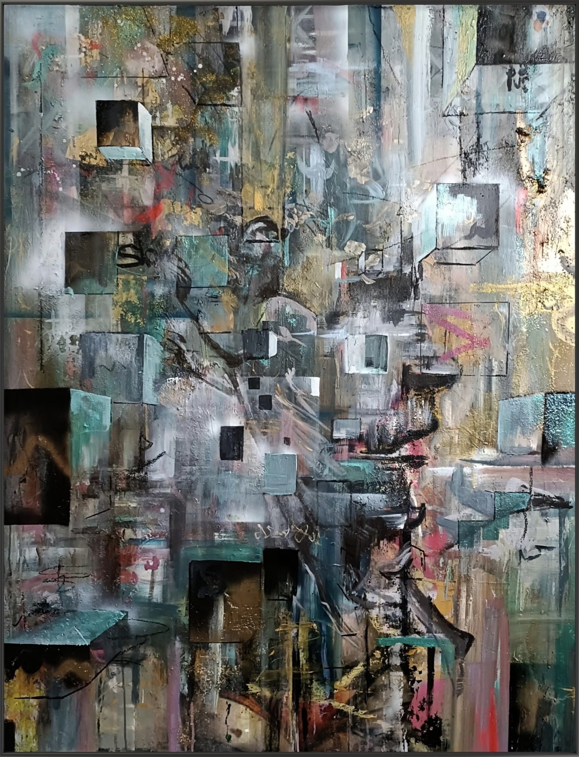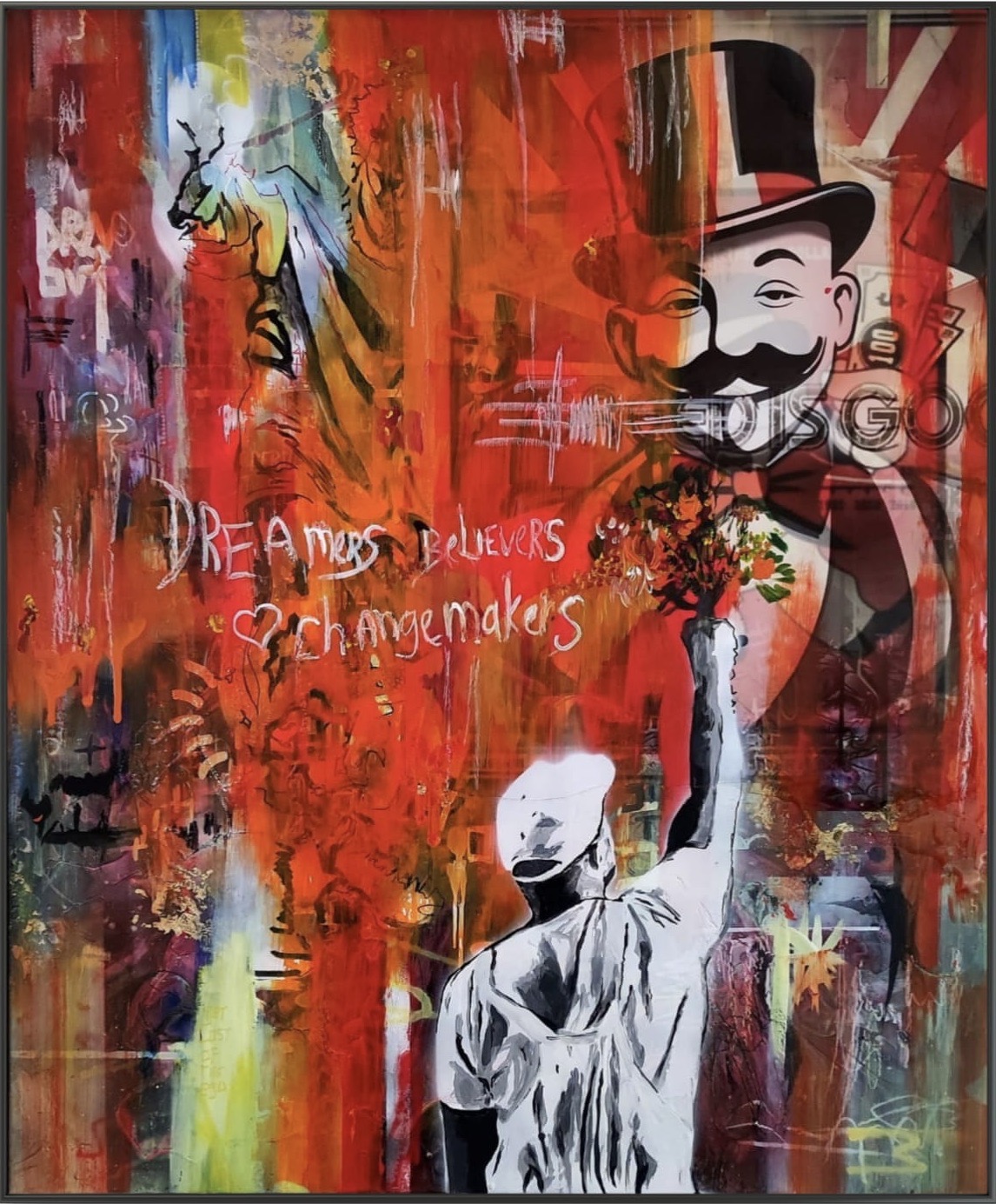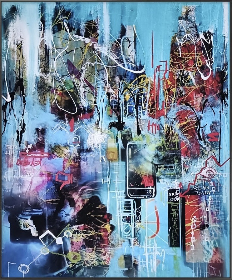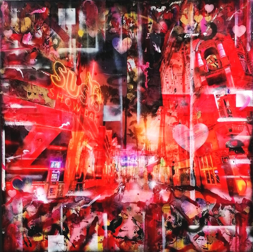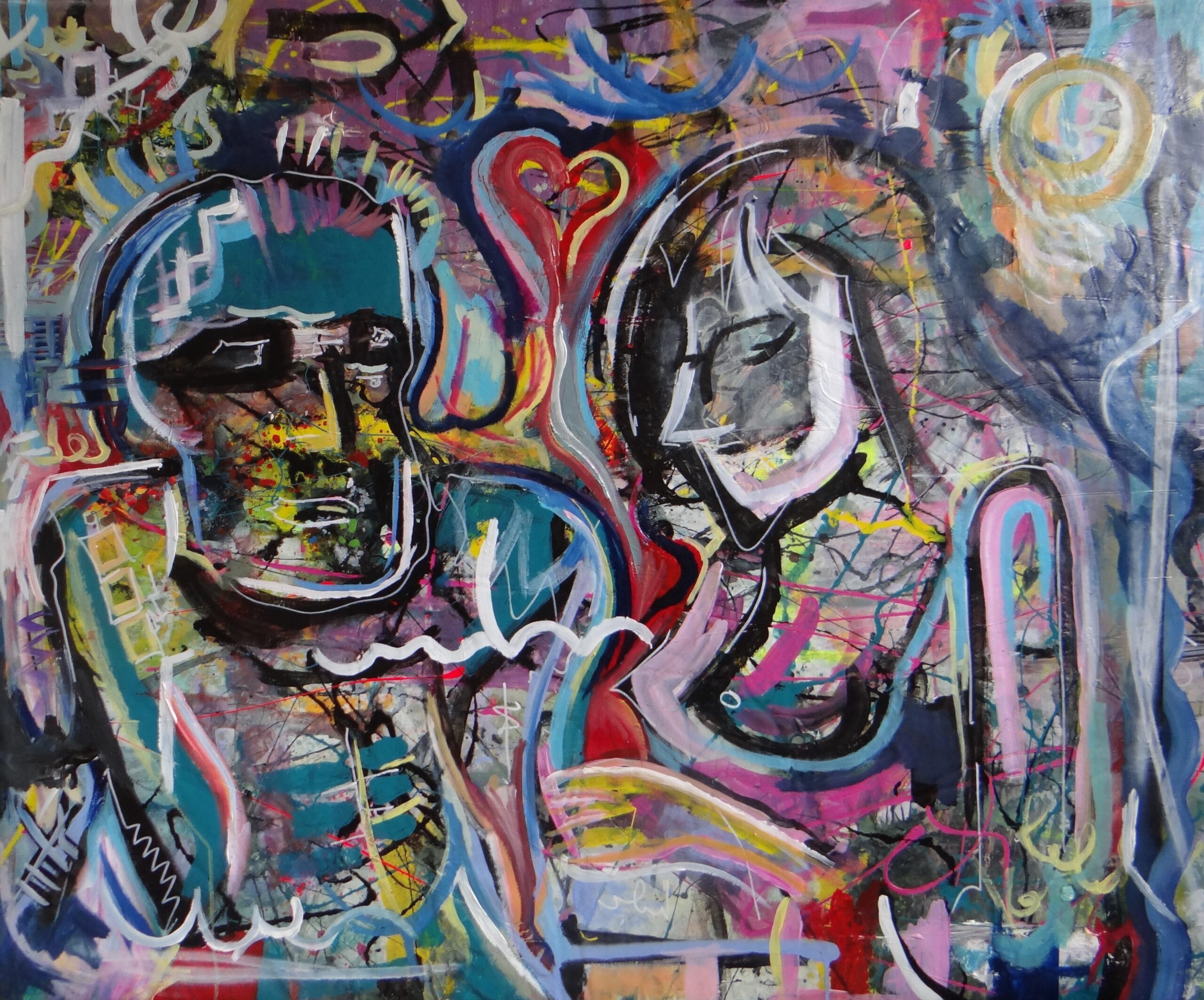 Jasper’s mixed media artworks examine the discovery of his own voice, a passage into the depth of figurative, abstract and collage along, with scribbles and graffiti, it is both modern and mythical. During our conversation, he explains the explorations of not thinking as he paints, listening to music and tapping into his self. There are synonyms in his reflection of city life and celebrity culture. As an artist who initially rejected his desire to follow his love of art, with all the practical assurances of having a normal job, conveyed to him by his father. He turned to study marketing and had a career in finance. His artworks only confirm his journey and his determination to live in the moment, his paintings’ configurations of what appears as the layering and ambiguities of society. The nuances of ordinary, capitalism, popular culture, and the subtext of relationships and sexualisation. Yet his work delves into the hidden depths of how I would visualise the conscience and unconscious at odds with each other, or the scenarios of trying to understand our dreams, the quandary of analysis in pictures. Jasper’s story as an artist, who took up the paint brush full time in 2019, and ended his permanent job, so he could feel the freedom to choose how to be in the moment and to control his own life. Whether it was spending more time with his children and doing something his heart desired. His paintings epitomise the social structures of our society and the role we all play in the subversive ideology, and how we accept it.